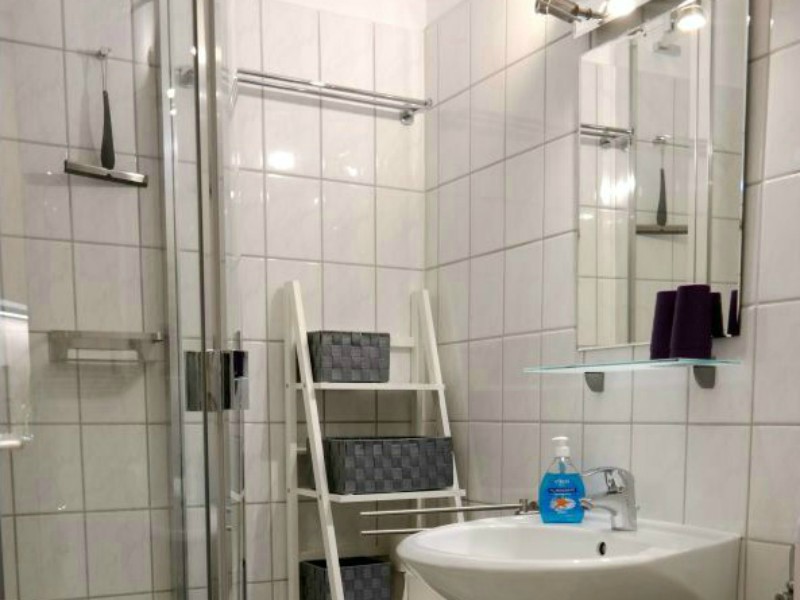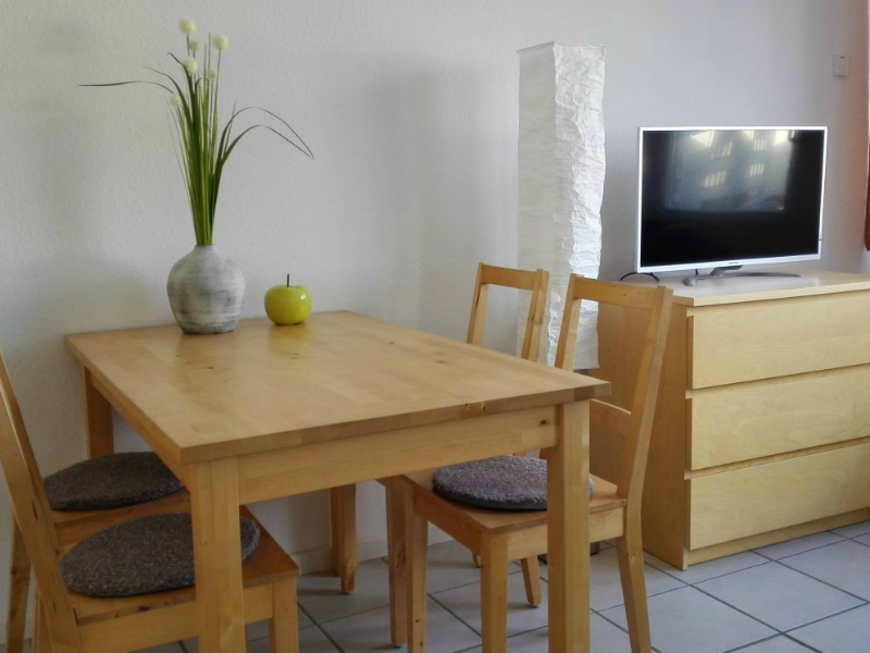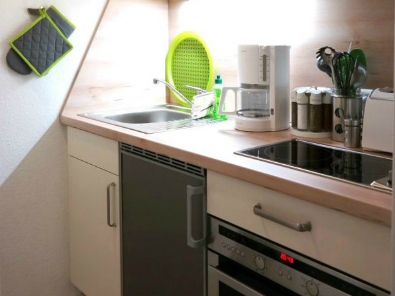 Die Wohnung enthält eine kleine, gut ausgestattete Küchenzeile mit 2 Cerankochfeldern, Backofen mit integrierter Mikrowelle, Kühlschrank mit Gefrierfach***, Kaffeemaschine, Wasserkocher, Toaster, Eierkocher etc.
