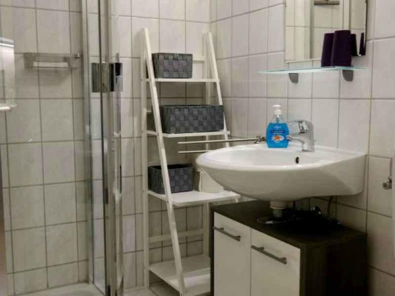 Das Bad ist ausgestattet mit einer geräumigen Dusche, WC, Waschbecken, Regal und Handtuchheizkörper.