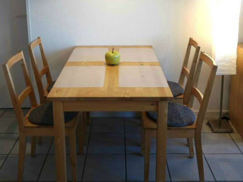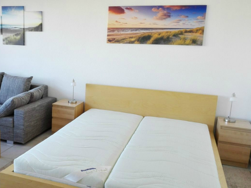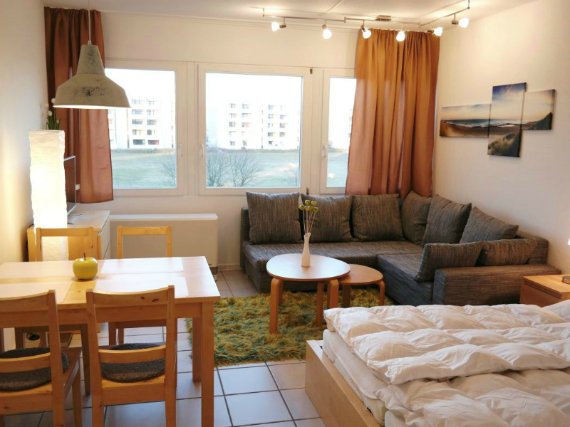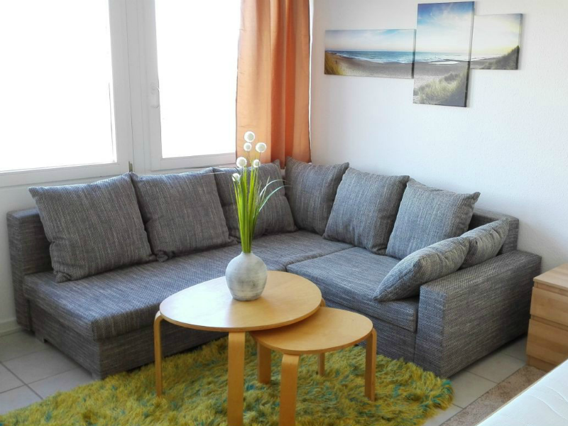 Das Wohn-/Schlafzimmer ist mit einer Essecke und einem Ecksofa für 4 Personen, einem Doppelbett (2 Matratzen 80 x 200 cm), Kommode, Fernseher und Radio-/CD-Spieler ausgestattet.